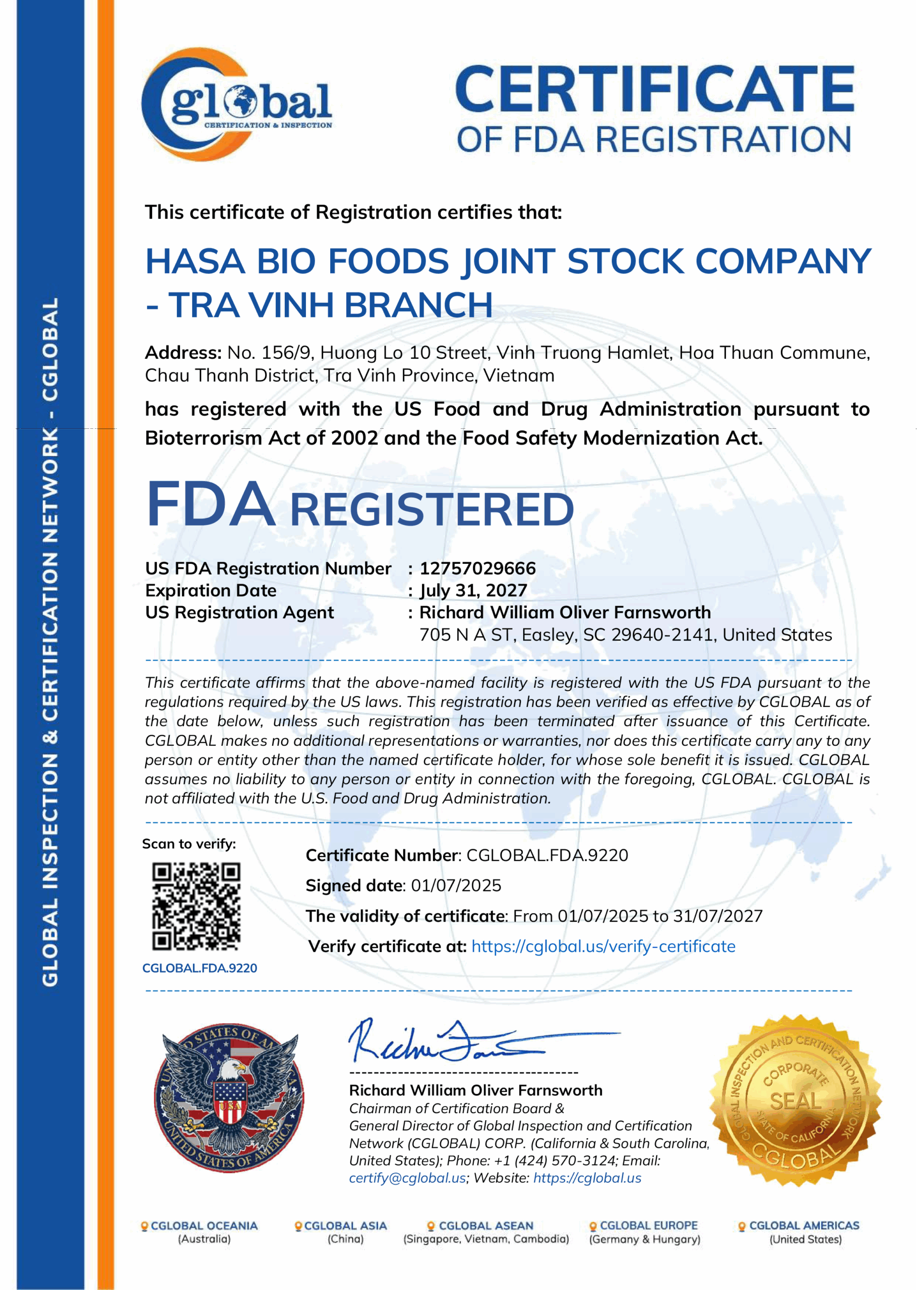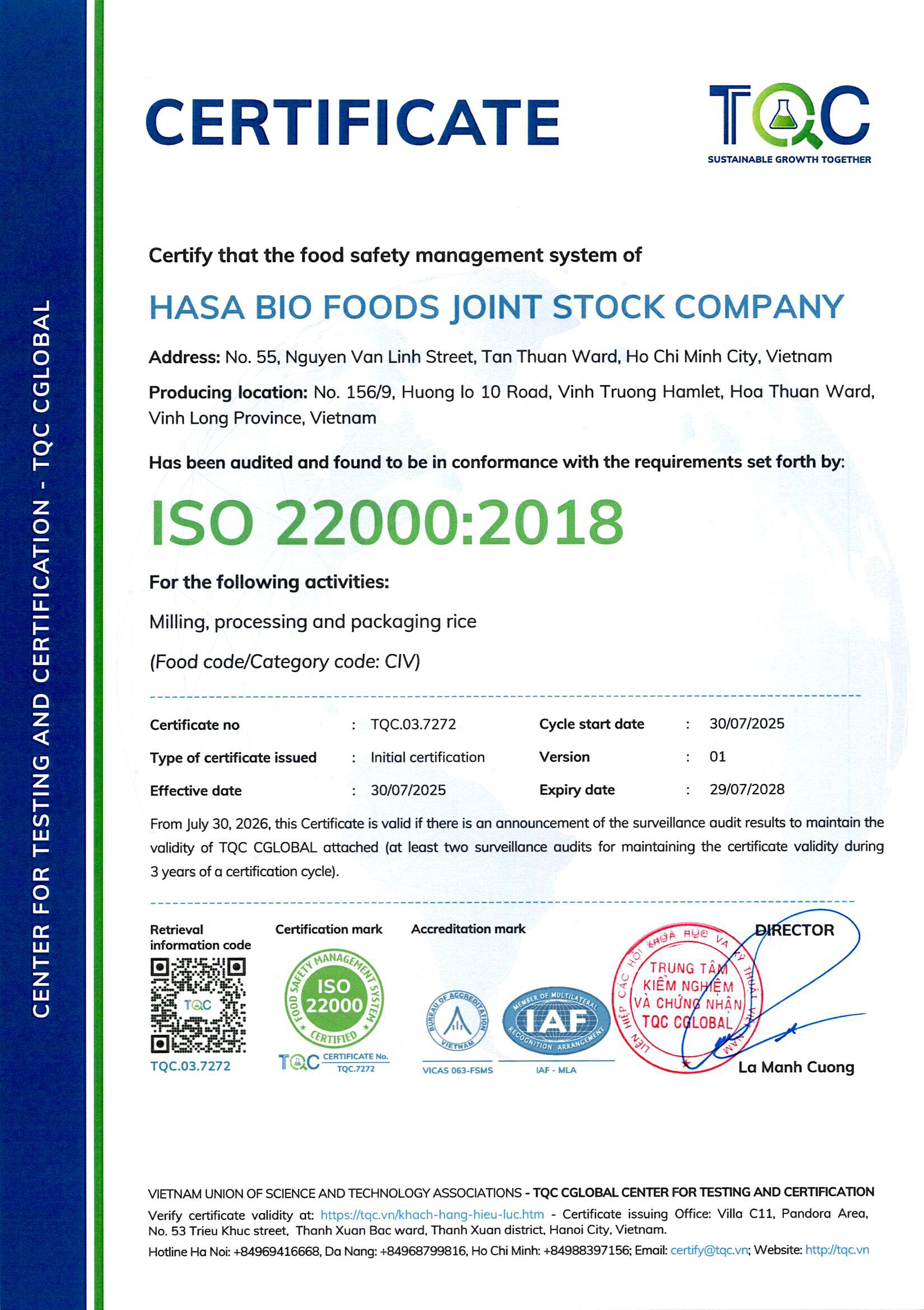 Đến cuối năm 2025 Công ty Hasa Bio Foods sẽ mở rộng diện tích vùng nguyên liệu đạt chuẩn hữu cơ EU và USDA lên 150 ha. Kế hoạch năm 2026 sẽ triển khai sản xuất trên 100% diện tích vùng nguyên liệu hữu cơ với gần 300 ha.